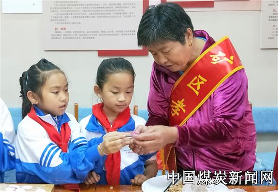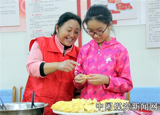 “孩子,你要这样拿褶子,包出的水饺才好看。”志愿者教职工子女包水饺。通过让职工子女参与志愿活动,了解祖国传统节日,从娃娃抓起传承孝道文化。