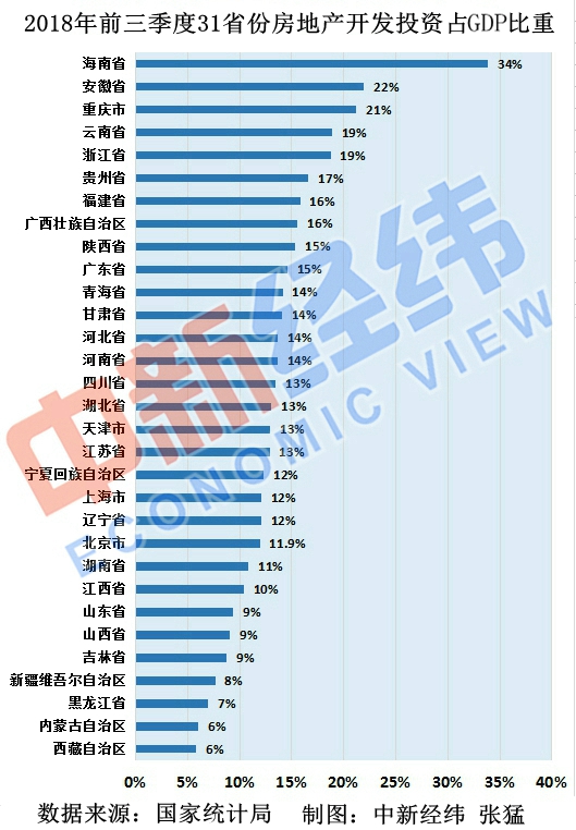 中新经纬客户端(微信公众号:jwview)梳理发现,2017年前三季度31省份“房地产开发投资占GDP比重”前三名与今年相同,也是海南、安徽、重庆。易居研究院智库中心研究总监严跃进认为,海南、安徽、重庆占比高与此三省的招商力度大有关系,也和具体的产业导入有关。