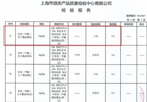 上述报告显示,西凤年份酒的邻苯二甲酸异丁酯(DIBP,俗称“增塑剂”)检测结果为1.44mg/kg,报告为限值0.5mg/kg;邻苯二甲酸二正丁酯(DBP,俗称“塑化剂”)检测结果为1.02mg/kg,对应限值为0.3mg/kg。两项塑化相关化学添加剂的含量均接近限定标准的三倍。