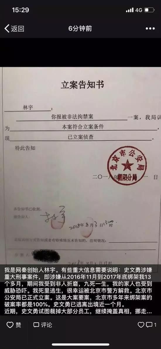 8月1日,北京市公安局朝阳分局对林宇报案的“非法拘禁”立案,8月14日,史文勇去往香港,至今未归,“我个人觉得肯定是有关联的,不然一个人不能在香港出差这么久,他现在在香港和泰国之间往返。”林宇对AI财经社说。