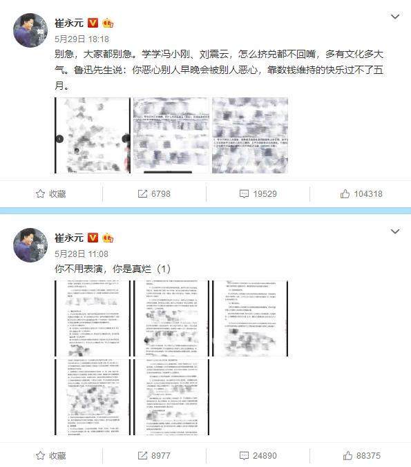 5月28日,崔永元通过其微博发布了几张演艺合同照片并配文:“你不用表演,你是真烂”,合同中因有范冰冰名字,其中曝光合同约定片酬为税后1000万元。一天后崔永元又再度曝范冰冰采用“大小”合同,另行约定片酬5000万元,两合同共拿走片酬6000万元,而实际上范冰冰只在片场呆了4天。范冰冰方面发布了一则“严正声明”,称崔永元侵犯合法权益,散布谣言,构成诽谤。范冰冰工作室回应,公开发布泄密合同并公然侮辱范冰冰的行为,既破坏了商业原则,又涉嫌侵犯合法权益,并称相关网络用户及媒体未经核实散布谣言的行为已经构成诽谤。