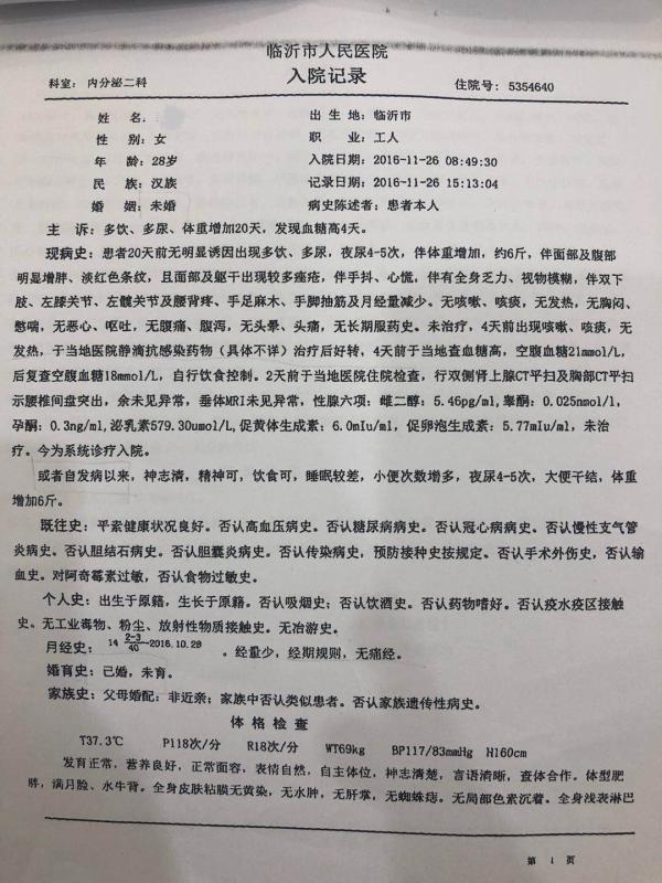 据临沂市人民医院2016年11月26日为刘畅出具的入院纪录显示,刘畅在20天前无明显诱因出现多饮、多尿,体重增加,面部腹部明显增胖,有淡红色条纹,并有手抖、心慌、浑身乏力、视物模糊、手足抽筋、关节疼痛等症状。入院后的检查结果显示,刘畅的心率、肝功及内分泌等都出现了异常,血糖畸高,但却排除了患有库欣病的可能,一家人一时不知道刘畅到底得了什么怪病。