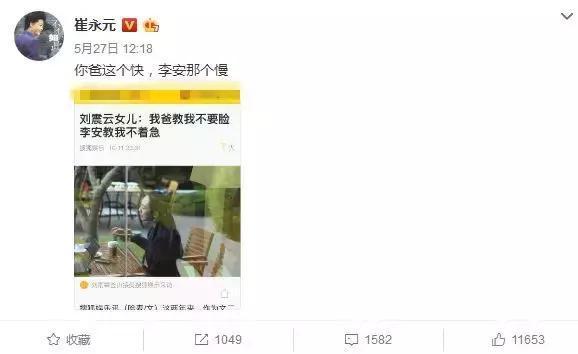 随后,崔永元将炮口对准刘震云一家,将其女儿刘雨霖此前接受媒体时透露出的“家教”贴在网上,并配有“我爸这个快,李安那个慢”的旁白。