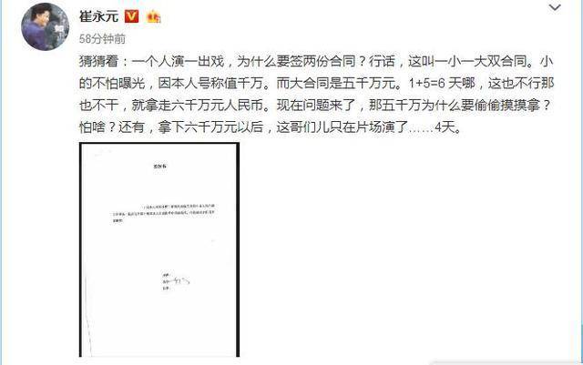 29日,崔永元再次发文。这次他又拿出一份“授权书”,并表示:某演员演一部戏会签双份合同,行话叫一小一大双合同,小合同是1000万,不怕曝光,而大合同则是5000万。那么5000万为什么要偷偷拿呢?同时他还透露“有人只在片场4天就拿走了6000万。”