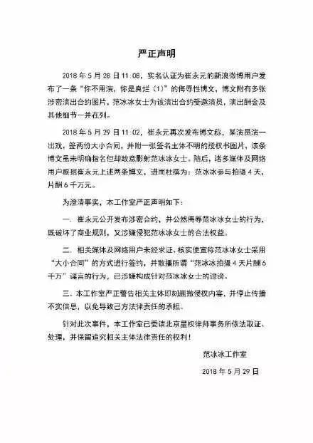 果然,接连几天的“炮轰”下,范冰冰工作室终于反击,发出严正声明,指出崔永元严重违反商业合同,并涉及侮辱女性,“影射范冰冰”,声明还要求他立即删除这些内容,不然就对他保留法律诉讼。