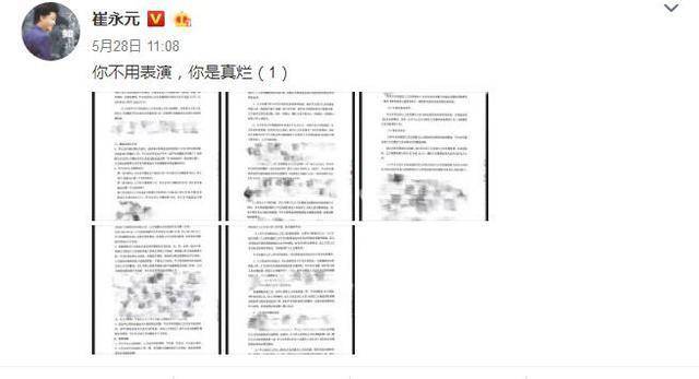接着,崔永元在28日晒出某艺人参演电影的5张合同扫描照片,并称:“你不用演戏,你是真烂。”从这几分合同中可以看出,该艺人片酬是1000千万,其住宿标准是五星级酒店豪华商务套房,餐费标准是1500一天。