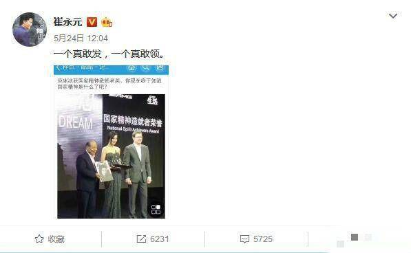 5月28日,崔永元先是在微博上发文怒怼范冰冰,贴上其8年前获得“国际精神造就者奖”的照片,并发出“一个真敢发,一个真敢领”的嘲讽。