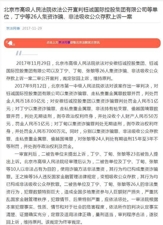 2017年11月29日,北京市高级人民法院依法对安徽钰诚控股集团、钰诚国际控股集团有限公司以及丁宁、丁甸、张敏等26人集资诈骗、非法吸收公众存款上诉一案二审公开宣判,裁定驳回上诉,维持原判。
