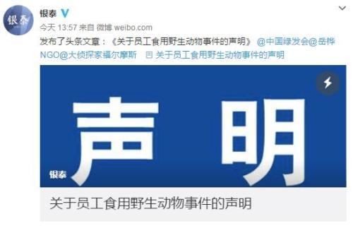 《声明》称,昨晚有网络自媒体发文称,我集团旗下杭州湖滨银泰in77副总经理、招商中心总经理沈剑平在境外私人旅游期间出现了食用野生保护动物穿山甲的不当行为。经公司与其本人进行核实,情况属实。