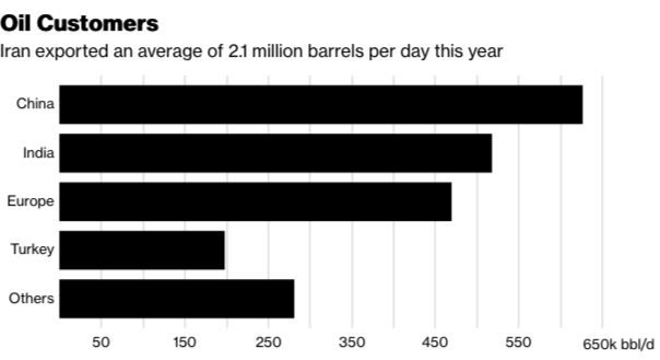 下图反映了伊朗的主要石油买家,分别是中国、印度、欧洲、土耳其等。今年伊朗平均每天出口210万桶石油。