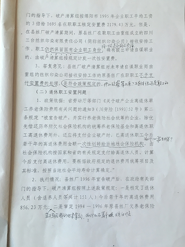 三台县工信局作出的《关于原县丝厂职工信访问题的答复意见》(部分)
