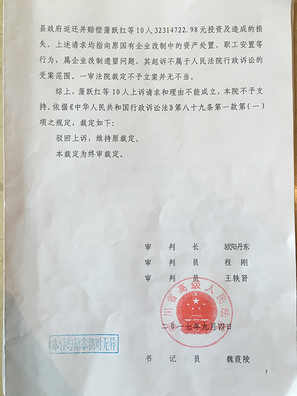 去年年初,蒲跃红和丁玉琼等10名员工代表将三台县政府起诉至绵阳市中级人民法院,要求三台县政府返还并赔偿3231万余元投资及给职工们造成的损失。