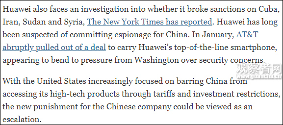 16日,《纽约时报》在报道中兴困局的文章中称,美国就华为是否违反了对古巴、伊朗、苏丹和叙利亚的贸易禁令展开了调查。但在18日,华为相关人士否认公司遭美国政府调查。