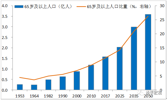 2)中国老龄化速度快、规模大,在世界前所未有。一般认为,65岁及以上老年人口比例在7%以上为老龄化社会,14%以上为深度老龄化,20%以上为超级老龄化。从老龄化过渡到深度老龄化,法国用了126年、英国46年、德国40年、日本25年(1970-1994年);从深度老龄化到超级老龄化,德国用了36年(1972-2008年),日本用了21年(1995-2006年)。新中国成立以来经历了三次人口出生高峰(1950-1957年、1962-1973年、1982-1991年),遵从人口发展的惯性规律,六十多年后必然形成三次人口老龄化冲击波。中国2001年进入老龄化社会,联合国《世界人口展望(2017修订版)》预计中国将用24年、即于2025年前后进入深度老龄化社会,再9年后即2034年前后进入超级老龄化社会,2050年达26.3%,到2060年后逐渐稳定在30%左右的水平,老龄化速度前所未有。并且,由于人口基数大,中国老年人口规模也是前所未有。2017年65岁以上老年人口已达1.6亿,预计到2050达3.6亿,届时每4个人就有1个65岁以上的老人。