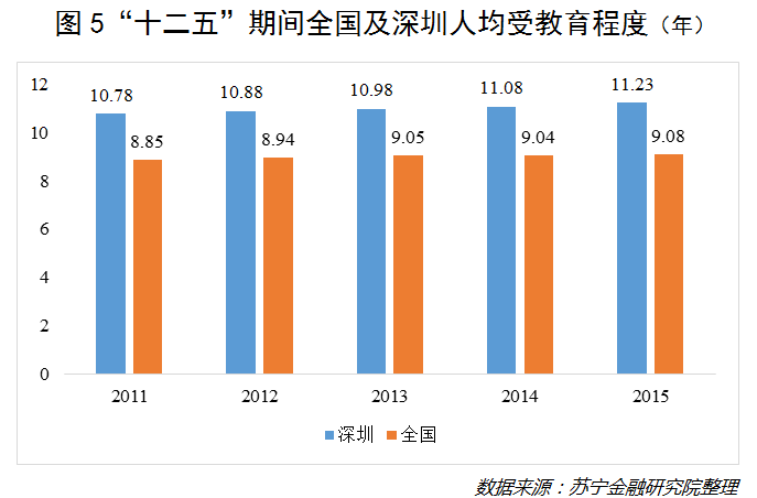(三)常住人口受教育水平全国领先。为迎合经济发展的人才资本需求,深圳市政府一直注重提升辖区内整体教育水平。整个“十二五”期间,深圳人均受教育年限均高于全国平均水平。在“十二五”末期,深圳人均受教育年限的平均水平达到11.23年,居全国前列(见图5),而全国的平均水平为9年。受教育年限的长短直接关系到人口素质的高低。由此看来,深圳常住人口的人力资本水平在全国处于领先水平。