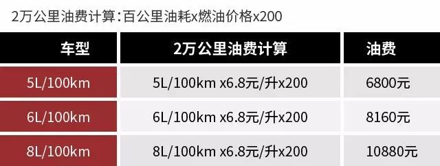 虽然现在很多人在购车时,都会考虑到油耗的高低,但对于实际油耗带来的费用差距,大家可能不太清楚。下面兵哥就以目前的92号汽油价格(6.8元/升)计算,在一年行驶2万公里的情况下,5L/100km、6L/100km和8L/100km的车型,一年下来相差多少油费。