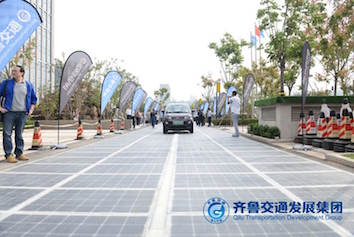 今年9月29日,该公司同在山东济南建成了中国首条光伏路面示范区,历时10个月完成了660平方米路面的铺设并实现并网发电。同时,该示范区还配备了电动汽车充电桩、智能引导标线等衍生应用设施,是中国首例光伏路面试验段,也是全球首条全路幅宽度铺设的光伏路面。