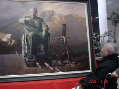 老英雄李二喜观看韶关美院朱广新为他作的油画 资料图