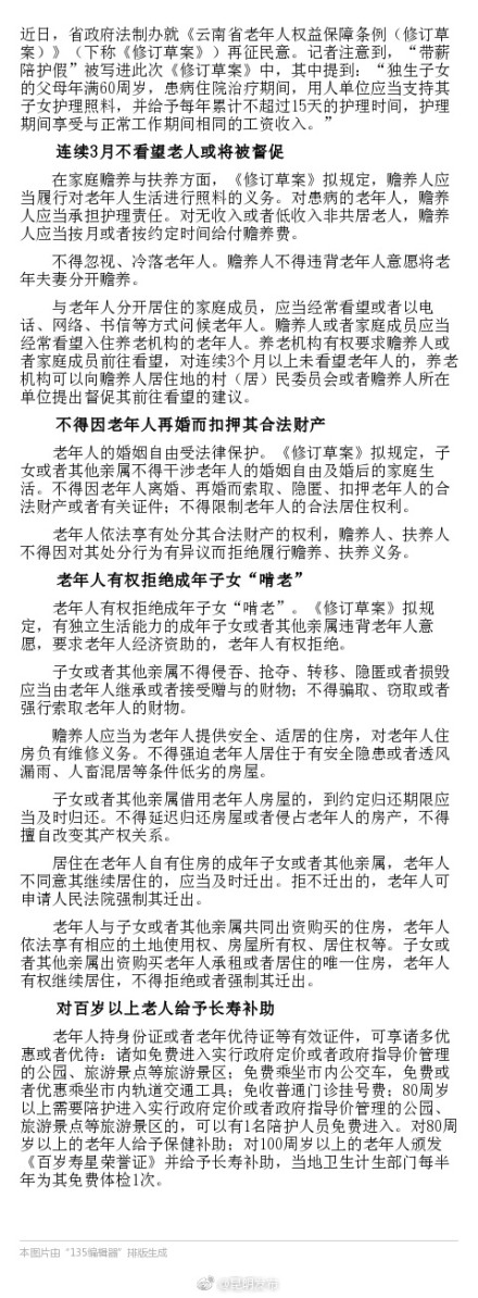 近日,省政府法制办就《云南省老年人权益保障条例(修订草案)》(下称《修订草案》)再征民意。记者注意到,“带薪陪护假”被写进此次《修订草案》中,其中提到:“独生子女的父母年满60周岁,患病住院治疗期间,用人单位应当支持其子女护理照料,并给予每年累计不超过15天的护理时间,护理期间享受与正常工作期间相同的工资收入。