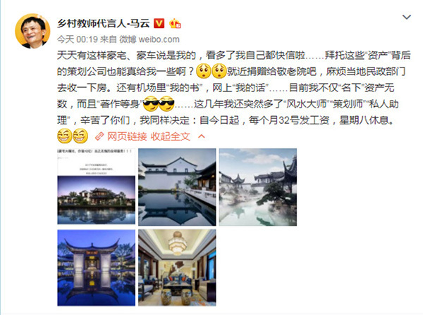 9月29日凌晨,阿里巴巴董事局主席马云在微博回应“豪宅”传闻,称“看多了我自己都快信啦”。他还一并回应了机场马云著作、网上马云语录,以及网络上所谓的“风水大师”“策划师”“私人助理”等诸多传闻。