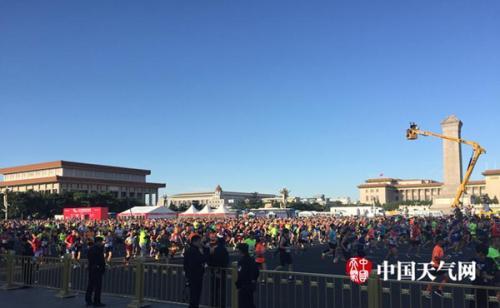 17日早晨,长跑选手齐聚天安门广场,2017北京马拉松正式开跑。(尤焕苓/摄)