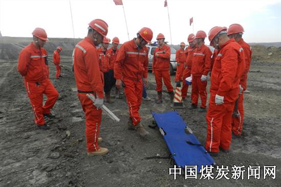 图为:胜利能源露天矿运输队领导查看事故应急预案演练效果,讨论如何进一步提高救援水平