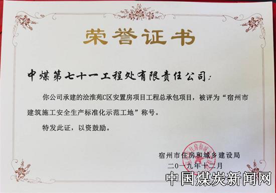 【本网讯】 近日,中煤七十一处承建的宿州浍淮苑C区安置房项目被宿州市住房和城乡建设局评为“宿州市建筑施工生产标准化示范工地”。