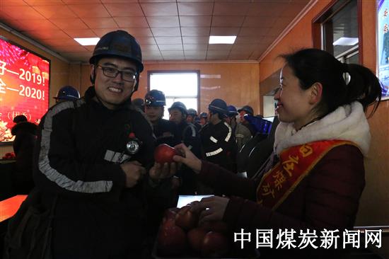 肥矿集团白庄煤矿女工协管员们将象征平安的红苹果递到即将下井的矿工师傅手中,叮嘱矿工师傅们一定牢记安全嘱托,时刻注意安全生产!吃着美味的苹果,欣赏着精彩的文艺节目,矿工们脸上洋溢着幸福的笑容和对新一年幸福生活的美好憧憬。