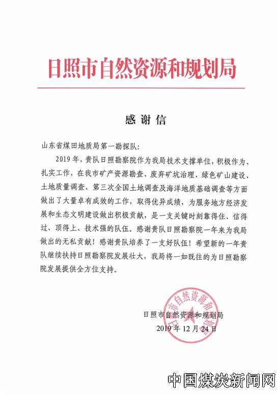 【本网讯】近日,山东省煤田地质局第一勘探队收到日照市自然资源和规划局发来感谢信,对一年来该队日照地质勘察院为日照市矿产资源勘查、地质环境治理等方面所做的工作给予了高度评价。