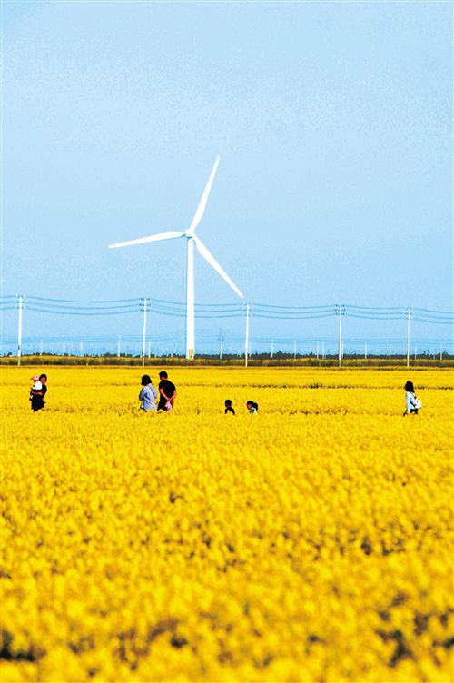 浙江省慈溪市现代农业开发区内油菜花田一片金黄,与田野中错落有致的风力发电装置构成现代农业的美丽画卷。 新华社记者 徐 昱摄