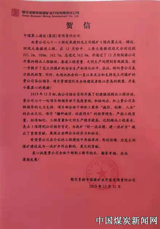【本网讯】 2019年12月份,中煤七十一处龙王沟项目部圆满完成三条大巷工作量,安全质量标准化水平和文明施工程度进一步提高,获甲方贺信。