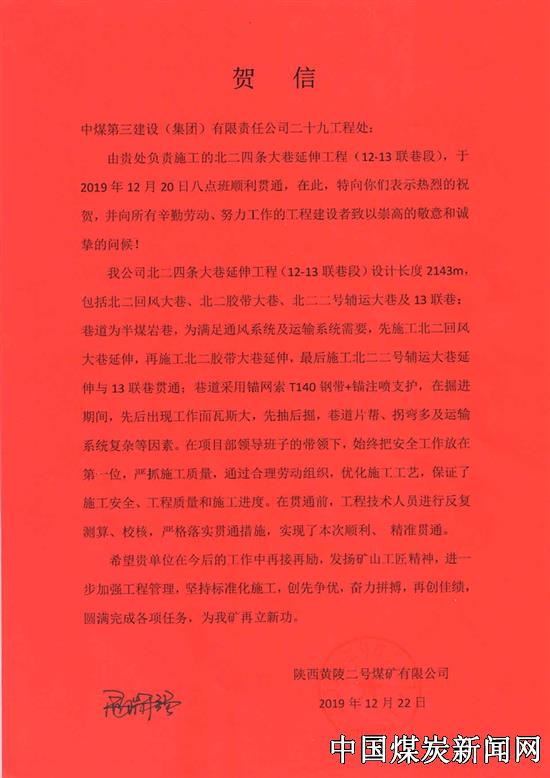 【本网讯】日前,陕西黄陵二号煤矿有限公司向中煤三建二十九工程处发来贺信,祝贺该处黄陵项目部施工的北二四条大巷延伸工程安全精准贯通。