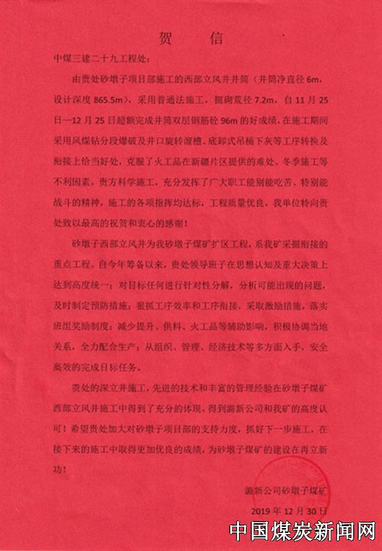【本网讯】近日,潞新公司砂墩子煤矿向中煤三建二十九工程处发来贺信,对砂墩子项目部施工的西部立风井井筒自11月25日至12月25日超额完成井筒双层钢筋砼96米的优异成绩表示祝贺和感谢。