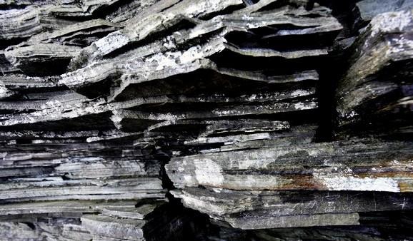 炭质页岩(资料图片)《颜山杂记》中所说的“测其石之层数”,“因上以知下,因远以知近”,就是说:只要在一个地方发现煤层,看清其旋回的岩层次序,并且找出标志层,再在同一地区的其他地方,寻找是否有和已知旋回以及标志层相同的地层。如果有,不必看见全貌,便能根据其上覆岩层,判断下面是否有煤。不论远近,都能找到。