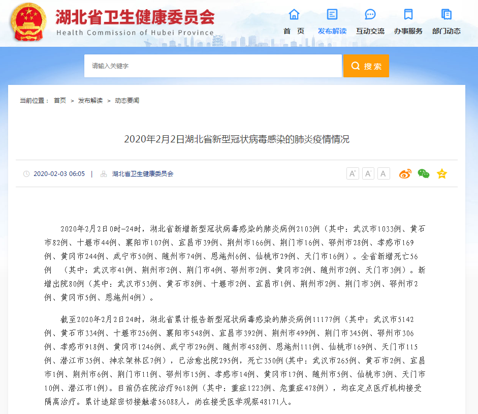 2020年2月2日0时-24时,湖北省新增新型冠状病毒感染的肺炎病例2103例(其中:武汉市1033例、黄石市82例、十堰市44例、襄阳市107例、宜昌市39例、荆州市166例、荆门市16例、鄂州市28例、孝感市169例、黄冈市244例、咸宁市50例、随州市74例、恩施州6例、仙桃市29例、天门市16例)。全省新增死亡56例 (其中:武汉市41例、荆州市2例、荆门市4例、鄂州市2例、黄冈市2例、随州市2例、天门市3例)。新增出院80例(其中:武汉市53例、黄石市8例、十堰市2例、宜昌市1例、荆州市2例、荆门市3例、鄂州市2例、黄冈市5例、恩施州4例)。