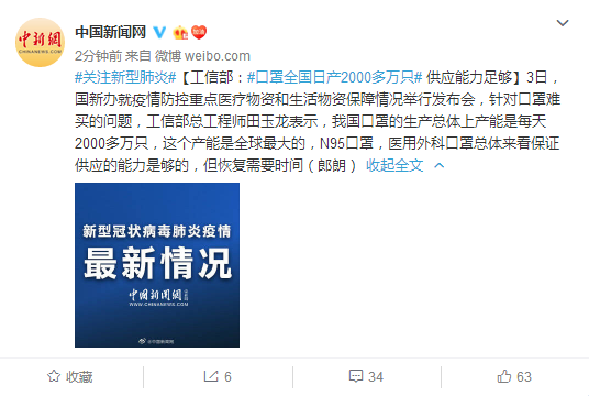【工信部:#口罩全国日产2000多万只# 供应能力足够】3日,国新办就疫情防控重点医疗物资和生活物资保障情况举行发布会,针对口罩难买的问题,工信部总工程师田玉龙表示,我国口罩的生产总体上产能是每天2000多万只,这个产能是全球最大的,N95口罩,医用外科口罩总体来看保证供应的能力是够的,但恢复需要时间(郎朗)