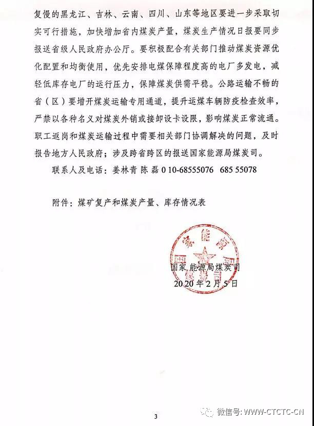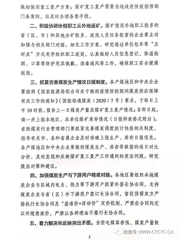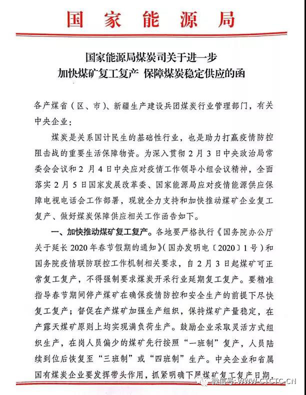 据了解,2月5日,国家能源局煤炭司还发布了关于进一步加快煤矿复工复产、保障煤炭稳定供应的函,公函指出,一要加快推动煤矿复工复产,二要积极协调休假职工从外地返矿,三要抓紧完善煤炭生产情况日报制度,四要加强煤炭生产与下游用户精准对接,五要着力解决和反映突出矛盾。