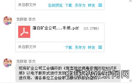 “坚定信心、同舟共济、科学防治、精准施策……”2月10日,疫情防控严峻的形势下的复工第一天,陕煤蒲白煤化运营公司第一时间就通过微信、QQ工作群转发矿业公司工会编制的《新型冠状病毒感染肺炎预防手册》电子版,让全体干部职工了解疫情防控知识,最大限度减少阻断传播途径,进一步提高干部职工预防新型冠状病毒感染肺炎的自我防护能力。
