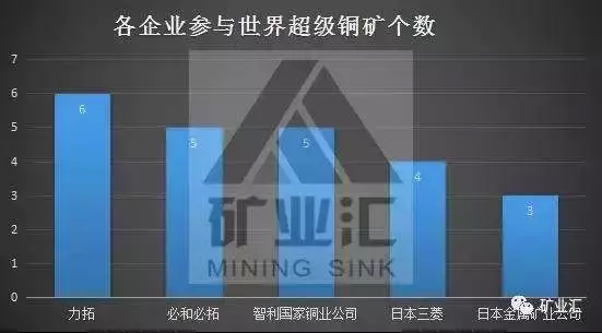 参与超级铜矿投资最多的公司是力拓公司,参与了6座超级铜矿的投资,其次是必和必拓、智利国家铜业公司两个公司并列第二,分别参与了5座超级铜矿的投资。第三是日本三菱公司,参与了4座超级铜矿的投资,第四是日本金属矿业公司,参与了3座超级铜矿的投资。