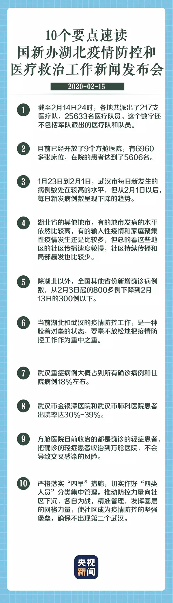 王贺胜:截至2月14日24时,各地共派出了217支医疗队,25633名医疗队员(不含军队派出的医疗队和队员),还调集了三个移动P3实验室。其中在武汉市有181支医疗队,20374名医疗队员。在其他城市,有36支医疗队,5259名医疗队员,这些都大大超过了2008年汶川特大地震医疗救援的调动规模和速度。