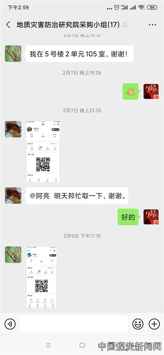 这是山东省煤田地质局第一勘探队瓦斯灾害防治中心防疫采购小组微信群的通讯场景。