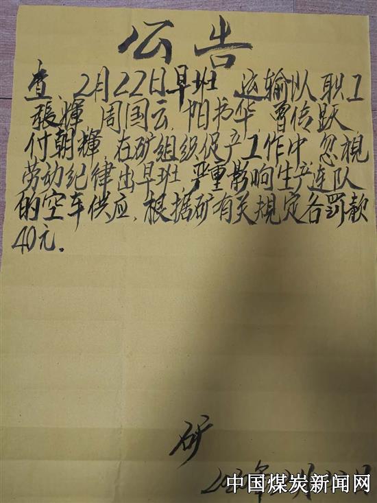 【本网讯】2月22日8:00分,湖南省湘煤集团冷水江市金竹山矿业公司一平硐矿调度室门口公告栏赫然贴着新年第一张黄色的罚款公告,格外引人注目。原来22日早班,运输队职工忽视劳动纪律,提前出了早班,结果导致生产连队空车紧缺,严重影响了全矿原煤产量,被各罚40元。