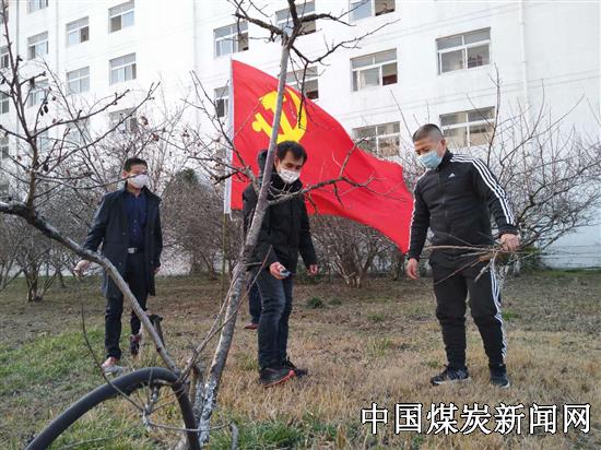 9点多了,鲜红的党旗还在迎着寒风飘扬,综采二区的党员还在卫生区忙碌着......