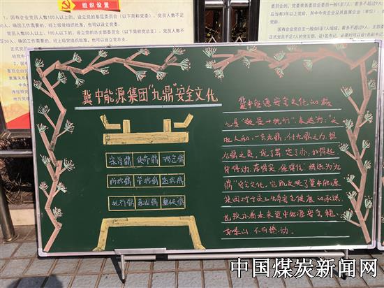 【本网讯】近日,冀中能源峰峰集团大社矿进行了“九鼎”安全文化板报展,将相关“九鼎”安全文化知识以板报形式供广大职工进行学习,形成微信线上、班前会、板报展等多方式贯彻学习方式,促进广大职工尽快融入“九鼎”安全文化,促进矿井安全生产。