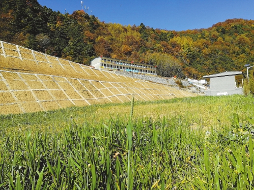 △鑫坑口渣波格子型的固定体覆土后,下面的渣场已经复绿。