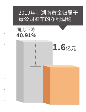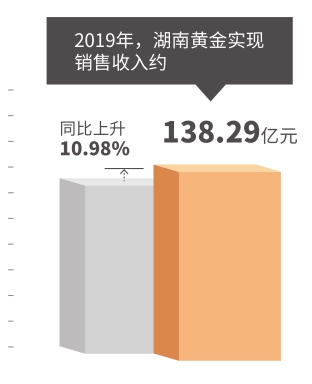 3月24日,湖南黄金股份有限公司发布2019年年度报告。报告显示,2019年湖南黄金股份共生产黄金约41.25吨,同比增长4.34%,完成全年计划的77.67%,其中生产标准金38.08吨、含量金3.17吨;实现销售收入约138.29亿元,同比增长10.98%,完成全年计划的86.43%;实现利润总额约1.95亿元,同比减少44.6%;实现归属于母公司股东的净利润约1.6亿元,同比减少40.91%。