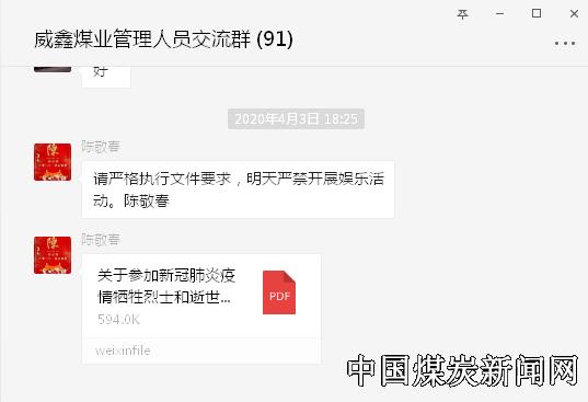 【本网讯】为表达对抗击新冠肺炎疫情斗争牺牲烈士和逝世同胞的深切哀悼。4月4日上午9:50分,威鑫煤业组织在矿的领导及管理人员在四楼会议室集中观看“新冠肺炎疫情”牺牲的烈士和逝世同胞全国哀悼活动直播,共悼逝者,寄托哀思。
