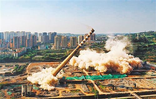 华电宜宾黄桷庄电厂烟囱爆破拆除现场。曾 朗摄(中经视觉)