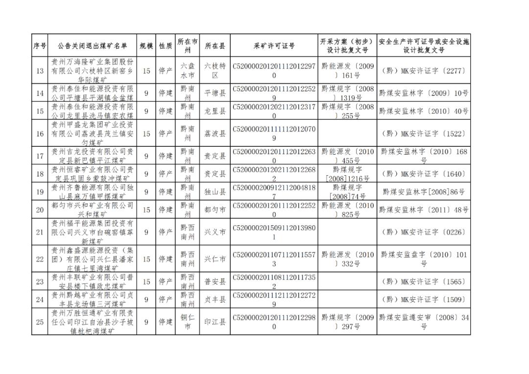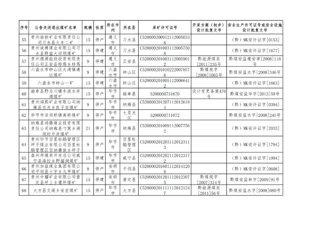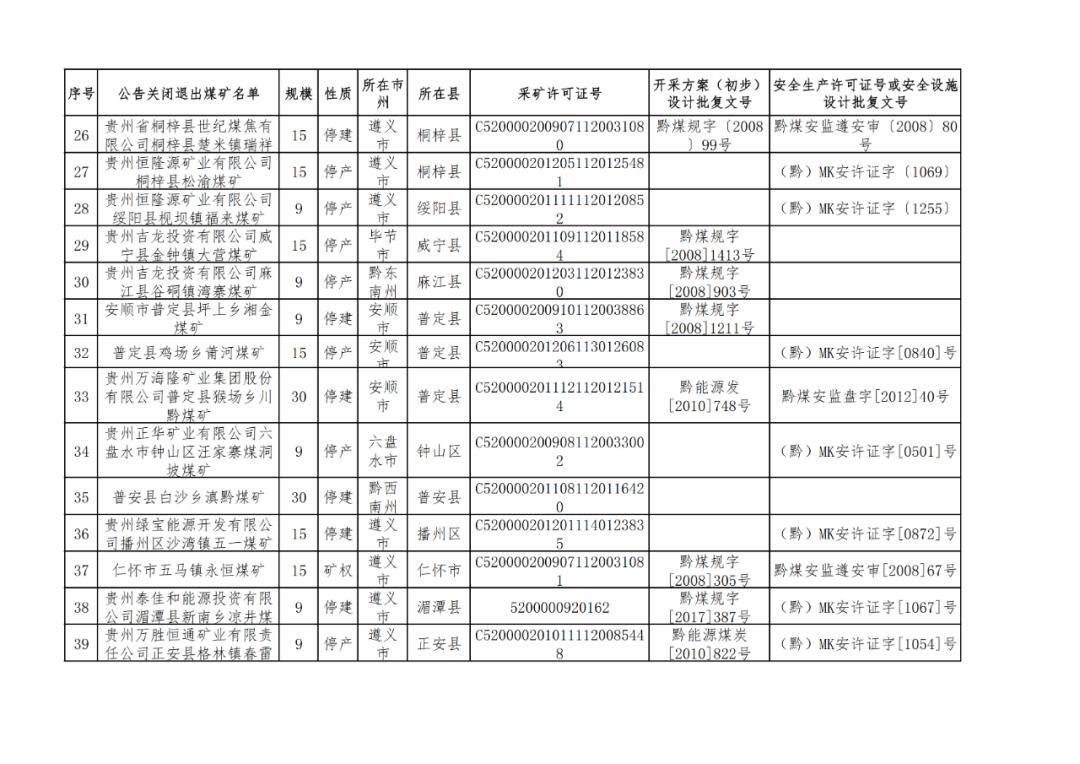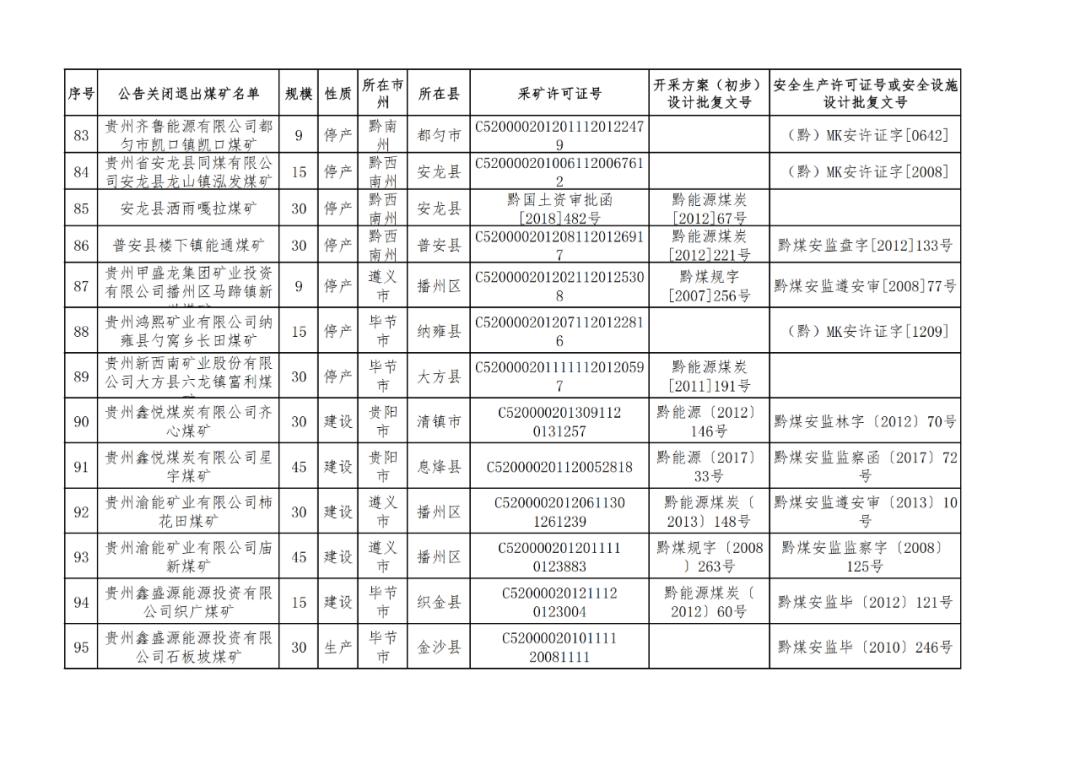 公告表示,按照《国务院关于煤炭行业化解过剩产能实现脱困发展的意见》(国发〔2016〕7号)、《贵州省人民政府关于煤炭工业淘汰落后产能加快转型升级的意见》(黔府发〔2017〕9号)、《贵州省人民政府办公厅关于印发贵州省30万吨以下煤矿有序退出方案的通知》(黔府办函〔2019〕69号)要求,各市(州)人民政府、有关县(市、区、特区)人民政府对2020年企业自愿申请关闭的安全生产条件差、资源枯竭、布局不合理和不符合国家产业政策的煤矿(含矿权)进行了审查,经公示无异议的企业自愿申请关闭98处煤矿。