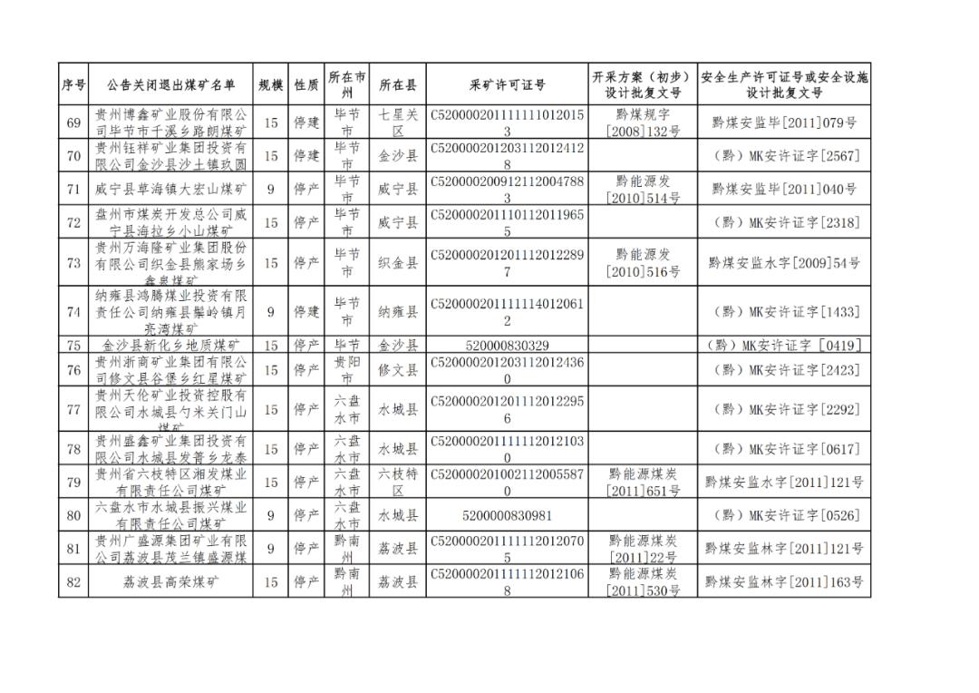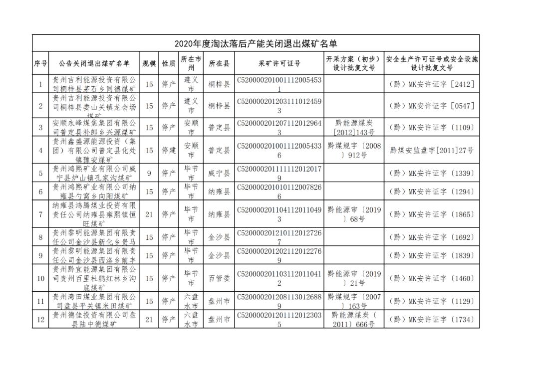 按照《国务院关于煤炭行业化解过剩产能实现脱困发展的意见》(国发〔2016〕7号)、《贵州省人民政府关于煤炭工业淘汰落后产能加快转型升级的意见》(黔府发〔2017〕9号)、《贵州省人民政府办公厅关于印发贵州省30万吨以下煤矿有序退出方案的通知》(黔府办函〔2019〕69号)要求,各市(州)人民政府、有关县(市、区、特区)人民政府对2020年企业自愿申请关闭的安全生产条件差、资源枯竭、布局不合理和不符合国家产业政策的煤矿(含矿权)进行了审查,现将经公示无异议的企业自愿申请关闭98处煤矿名单予以公告(详见附件),请各市(州)、有关县(市、区、特区)人民政府按要求做好以下工作。